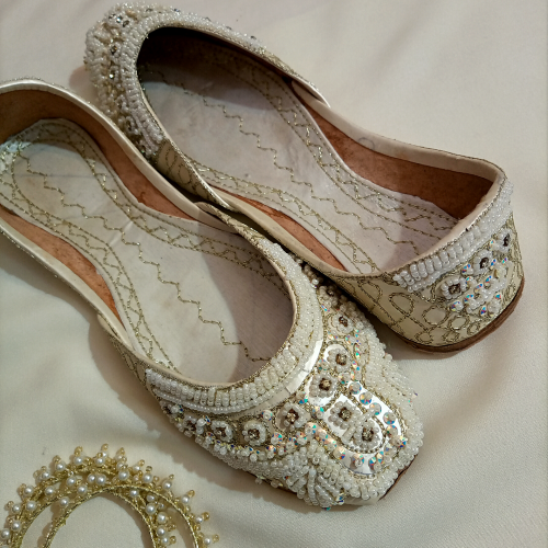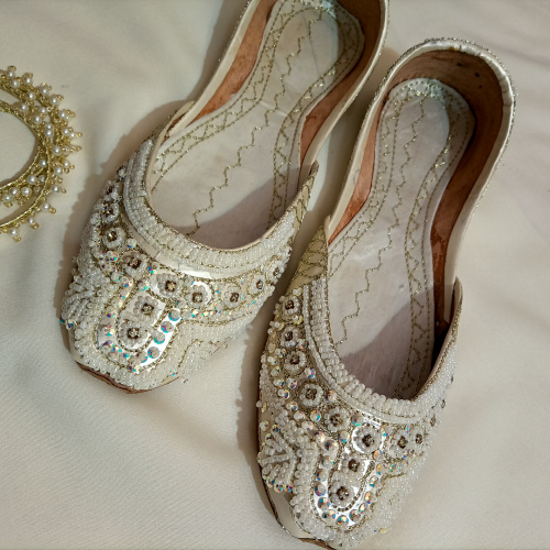 handcrafted White khussa emblished with Hand embroidery white pearl and stones on leather stuff, 100% pure leather sole